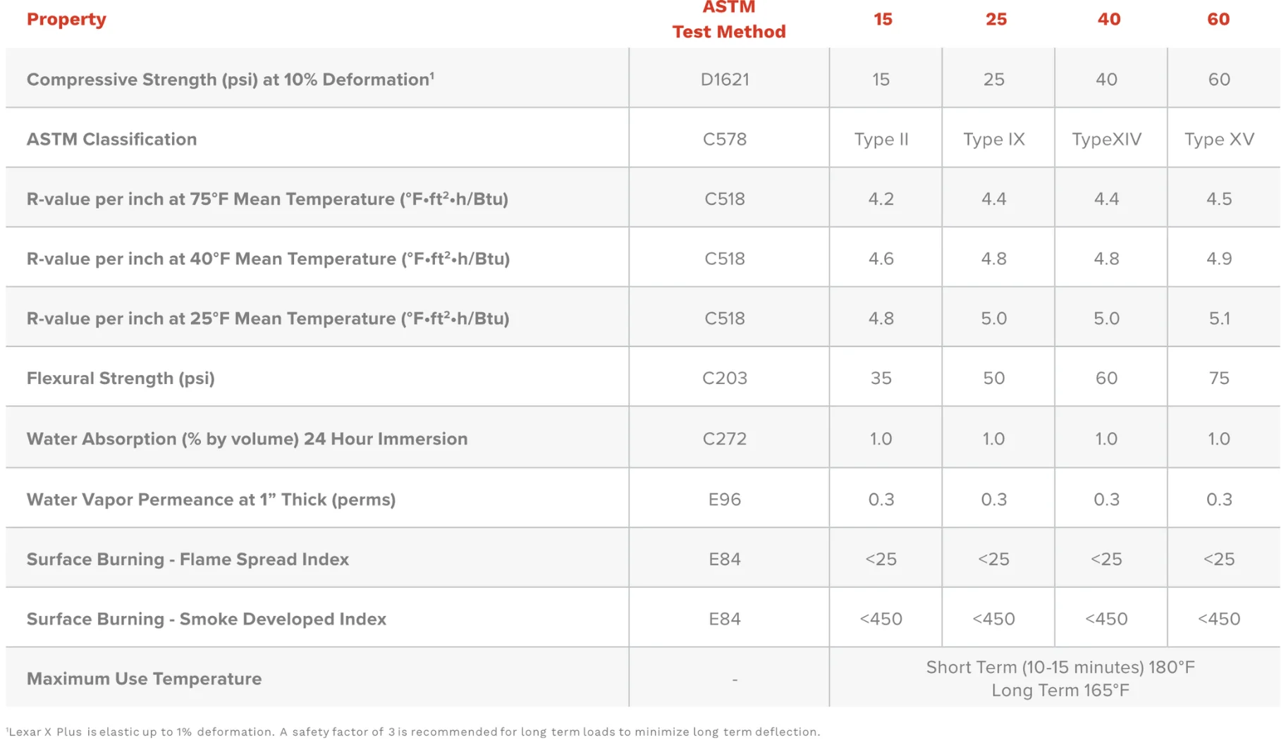- Compressive strength: 15, 25, 40, and 60 psi
